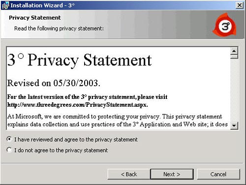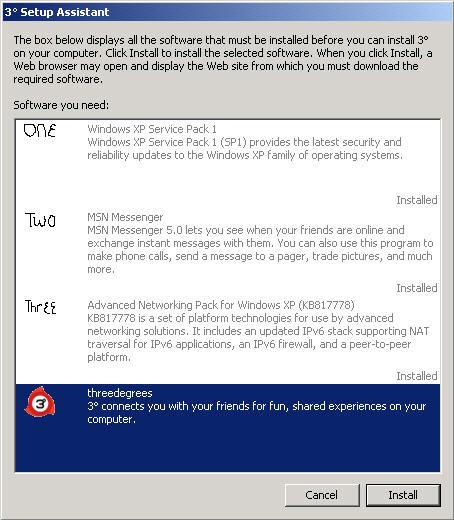 2. เนื่องจากการติดตั้ง TreeDegrees จำเป็นต้องตรวจสอบความพร้อมของ Windows XP ที่เราใช้ครับ หากผู้ใช้ท่านใดยังขาดไฟล์บางไฟล์ ในขั้นตอนนี้ก็จะบังคับให้เราทำการติดตั้งก่อน โดยจะเรียงลำดับการติดตั้ง ตั้งแต่ลำดับ One ,Two และ Three จากในรูปจะเห็นว่าโปรแกรมในข้อ One และ Two ผมมีแล้ว จะเหลือก็แต่ข้อ Three โปรแกรมก็จะเลือกให้ครับ เราก็เพียงแต่คลิกปุ่ม Install และทำตามขั้นตอนต่อไปจนสมบรูณ์ครับ